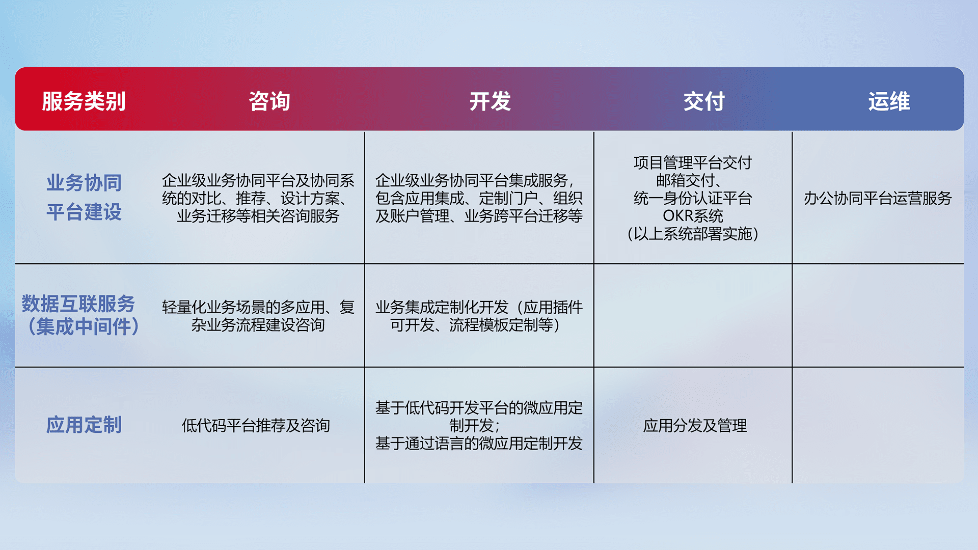 针对钉钉、、企微、、IDaas等平台级产品提供产品的规划、、、方案、、交付、、、定制化开发等服务,,,实现如统一协同办公、、、智能客户服务、、混合会议管理、、、智能数据查询、、、等业务场景,,,实现数字化转型。。。