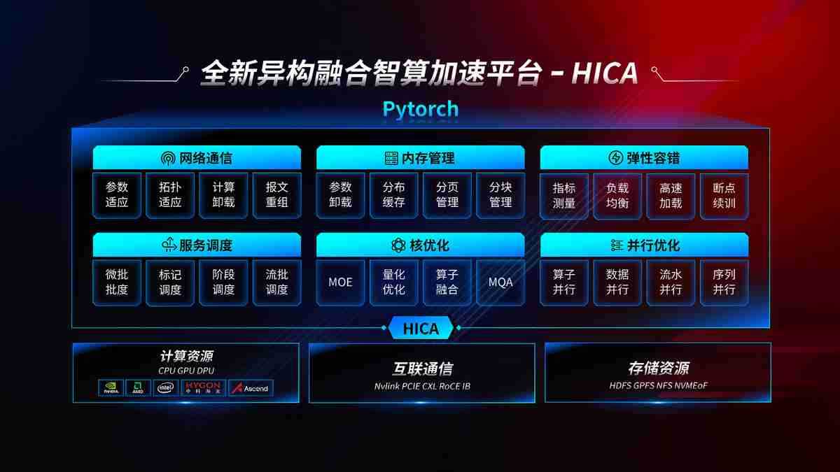 通过自研的服务层、、、、中间适配层、、、、以及调度编排算法,,,采用数据并行、、模型并行等多种并行方式,,,,把并行计算任务进行有效的分解,,使其分别由相应的软件栈和算力资源来承接。。。。当GPU资源变化,,,HICA可以实时动态调度计算子任务并调整模型拓扑和架构,,以充分聚合各种算力资源。。。